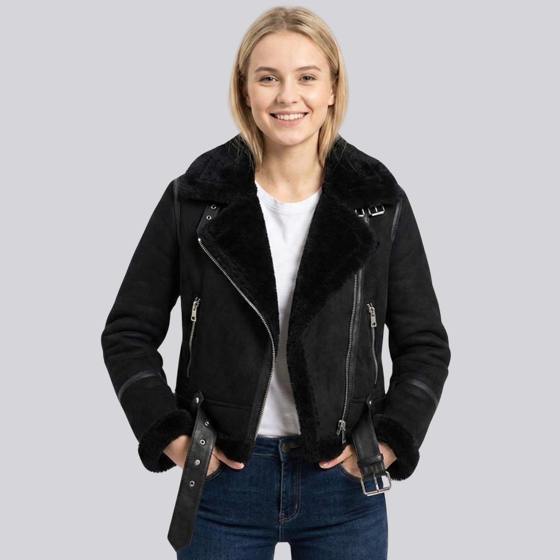 Pluszowa kurtka typu aviator wykonana z warstwy zamszowej w wyglądzie oraz grubej podszewki z imitacji kożuszka, zapewniającej pełne, otulające ciepło. Asymetryczny zamek, pasek w dolnej części i metalowe detale tworzą dopracowaną, użytkową sylwetkę. Utrzymana w ciepłych, jesiennych neutralnych odcieniach, zapewnia solidną izolację w chłodniejsze dni. Dla najlepszego dopasowania polecamy wybrać rozmiar większy.